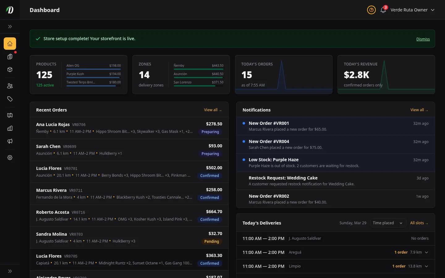 The moment you log in, you see exactly where your business stands. Product counts, active delivery zones, today's orders, and revenue — all on a single screen. Low stock alerts surface problems before they cost you sales.